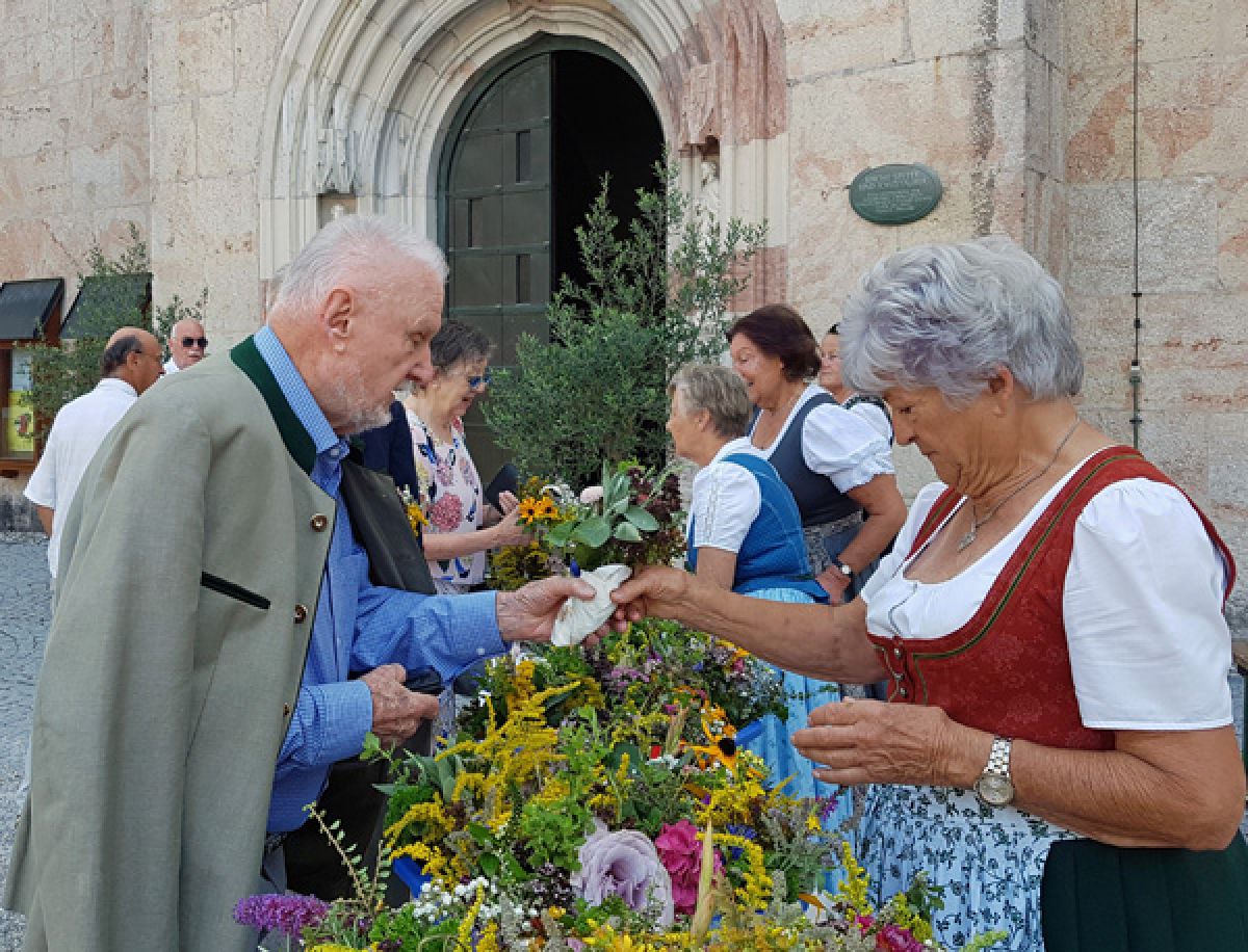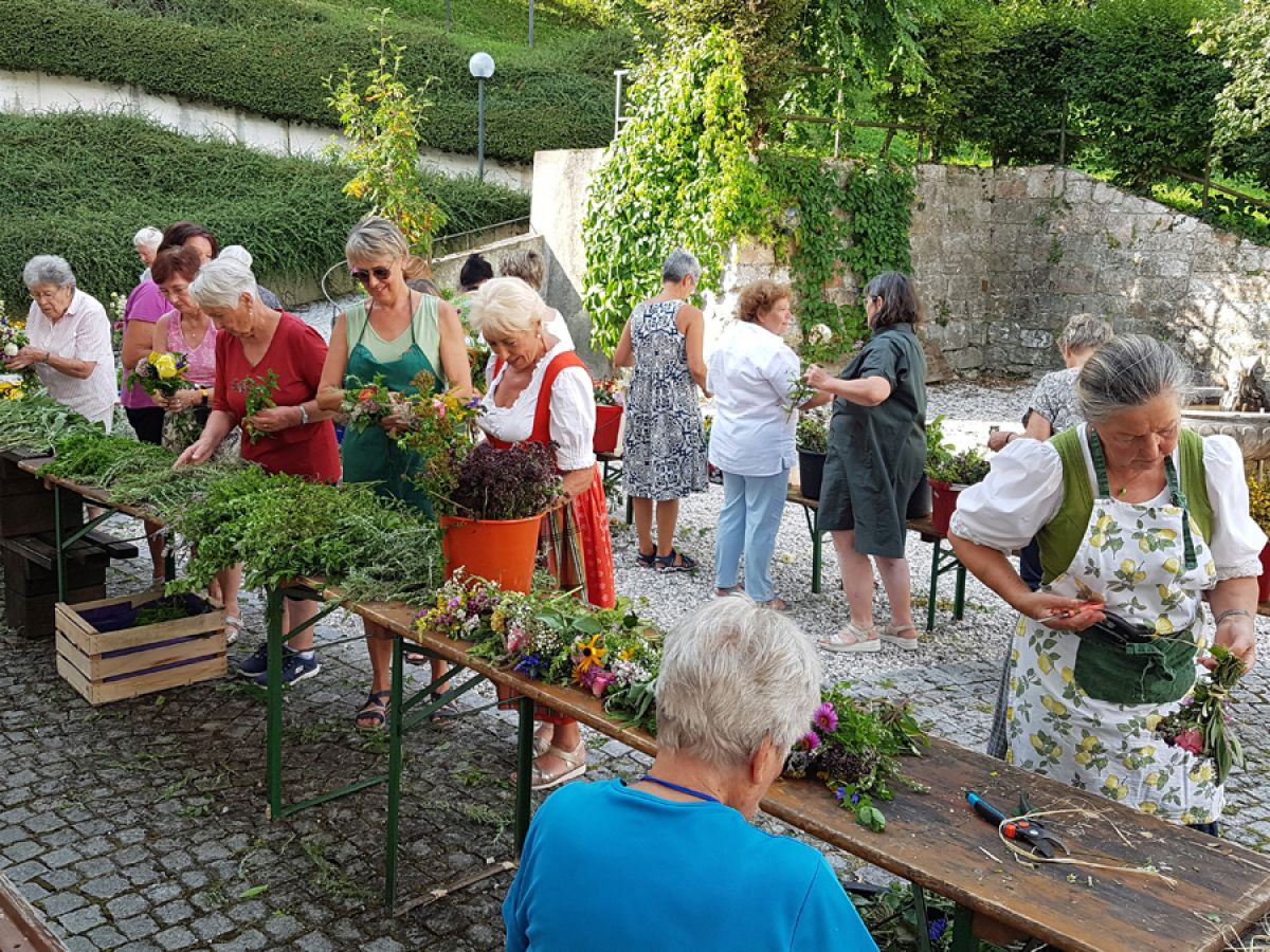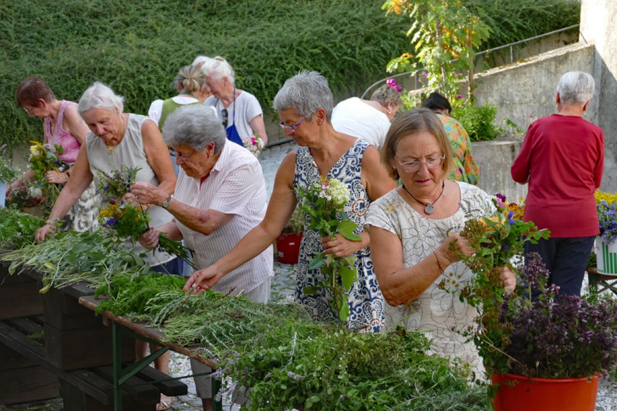 Viele fleißige Hände des KDFB Berchtesgaden unter der Leitung von Ursi Birkner sorgten bereits zum 42. Mal am Vorabend des Festes  "Aufnahme Mariens in den Himmel" wieder für zahlreiche Blumen und Kräuter aus dem eigenen Garten und vom Sammeln in freier Natur. Auch gaben Blumengeschäfte wieder Spenden für die Kräuterbuschen ab. 25 bestens gelaunte Frauen halfen im Garten des Pfarrheimes beim Binden der 325 Sträuße und genossen nach getaner Arbeit eine köstliche Brotzeit.