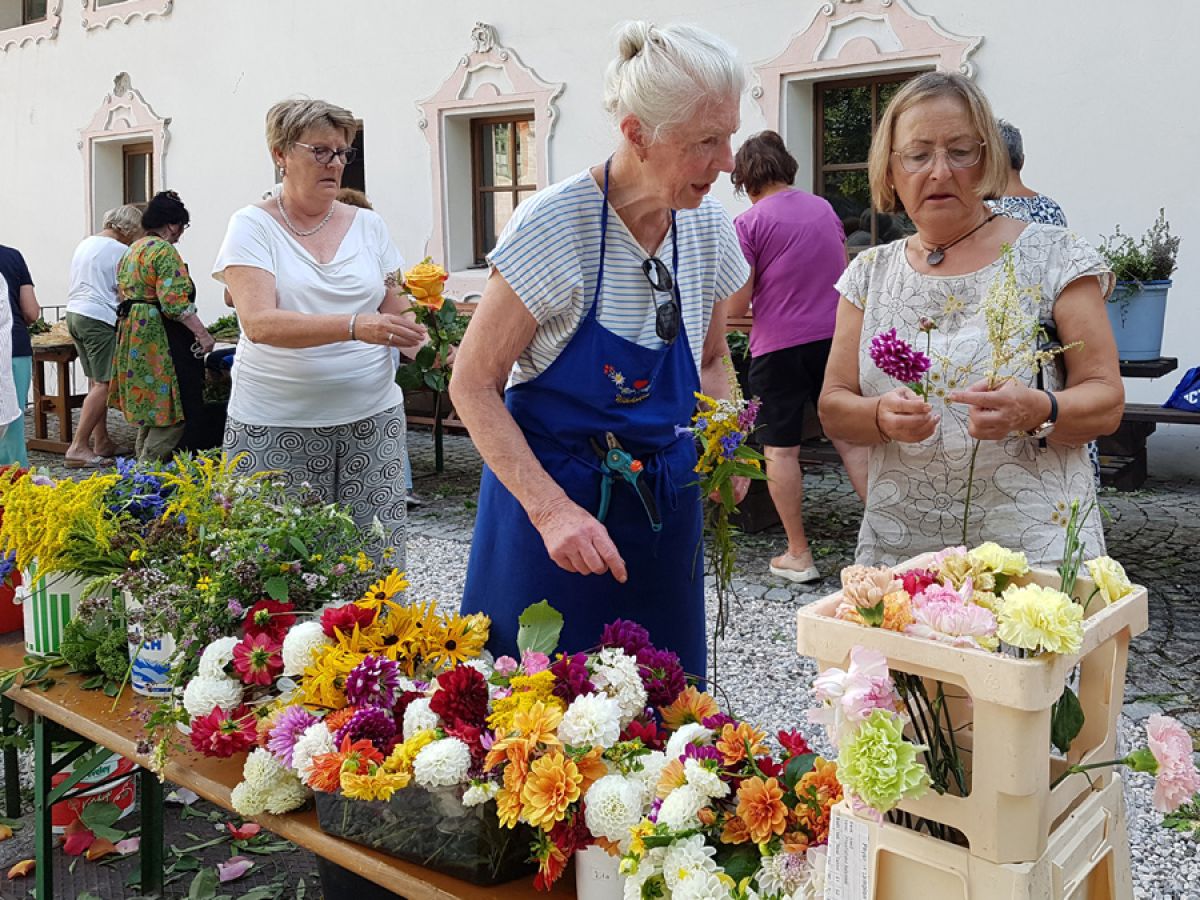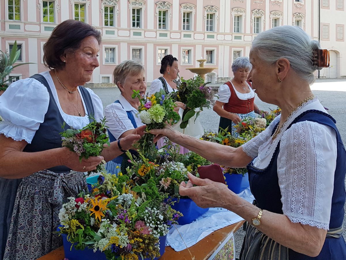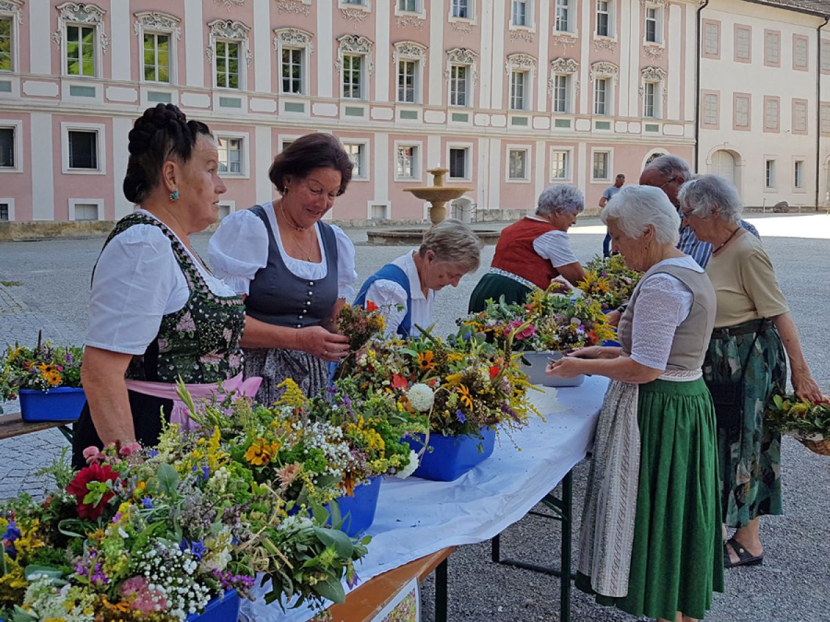 Viele fleißige Hände des KDFB Berchtesgaden unter der Leitung von Ursi Birkner sorgten bereits zum 42. Mal am Vorabend des Festes  "Aufnahme Mariens in den Himmel" wieder für zahlreiche Blumen und Kräuter aus dem eigenen Garten und vom Sammeln in freier Natur. Auch gaben Blumengeschäfte wieder Spenden für die Kräuterbuschen ab. 25 bestens gelaunte Frauen halfen im Garten des Pfarrheimes beim Binden der 325 Sträuße und genossen nach getaner Arbeit eine köstliche Brotzeit.