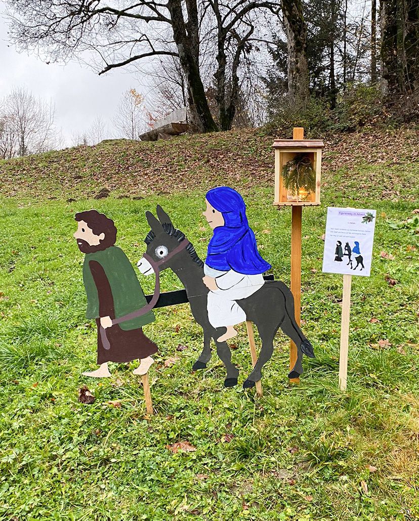 Corona verbot damals, sich zu treffen, gemeinsam zu beten, sich gemeinsam aufzumachen. Um trotzdem etwas gemeinsames zu erleben, entstand der Krippenweg mit zehn Stationen. Gemeinsam mit Maria konnten die Familien den weiten Weg von Jerusalem nach Bethlehem gehen.