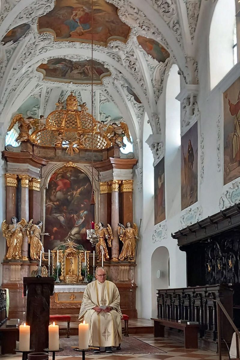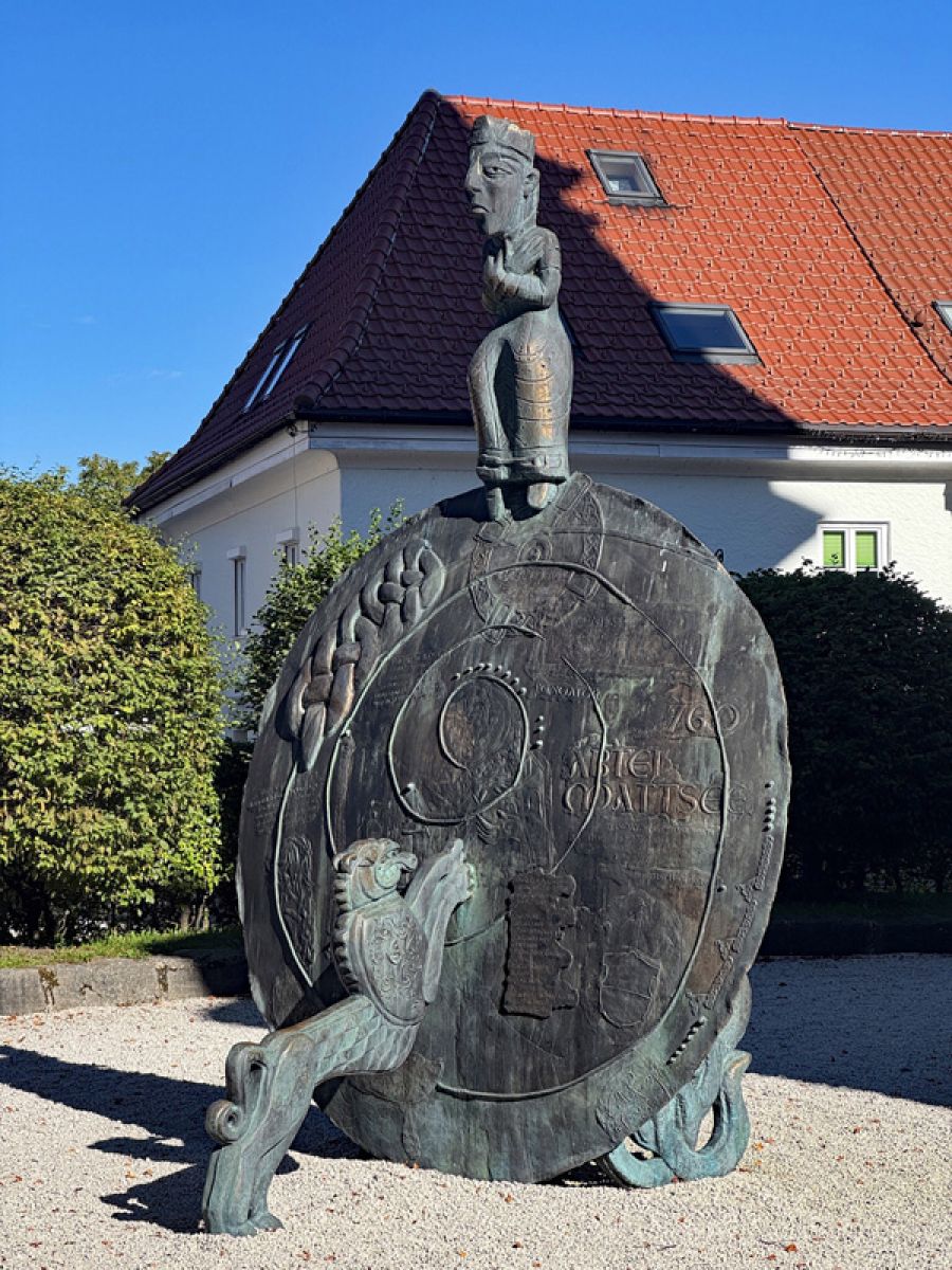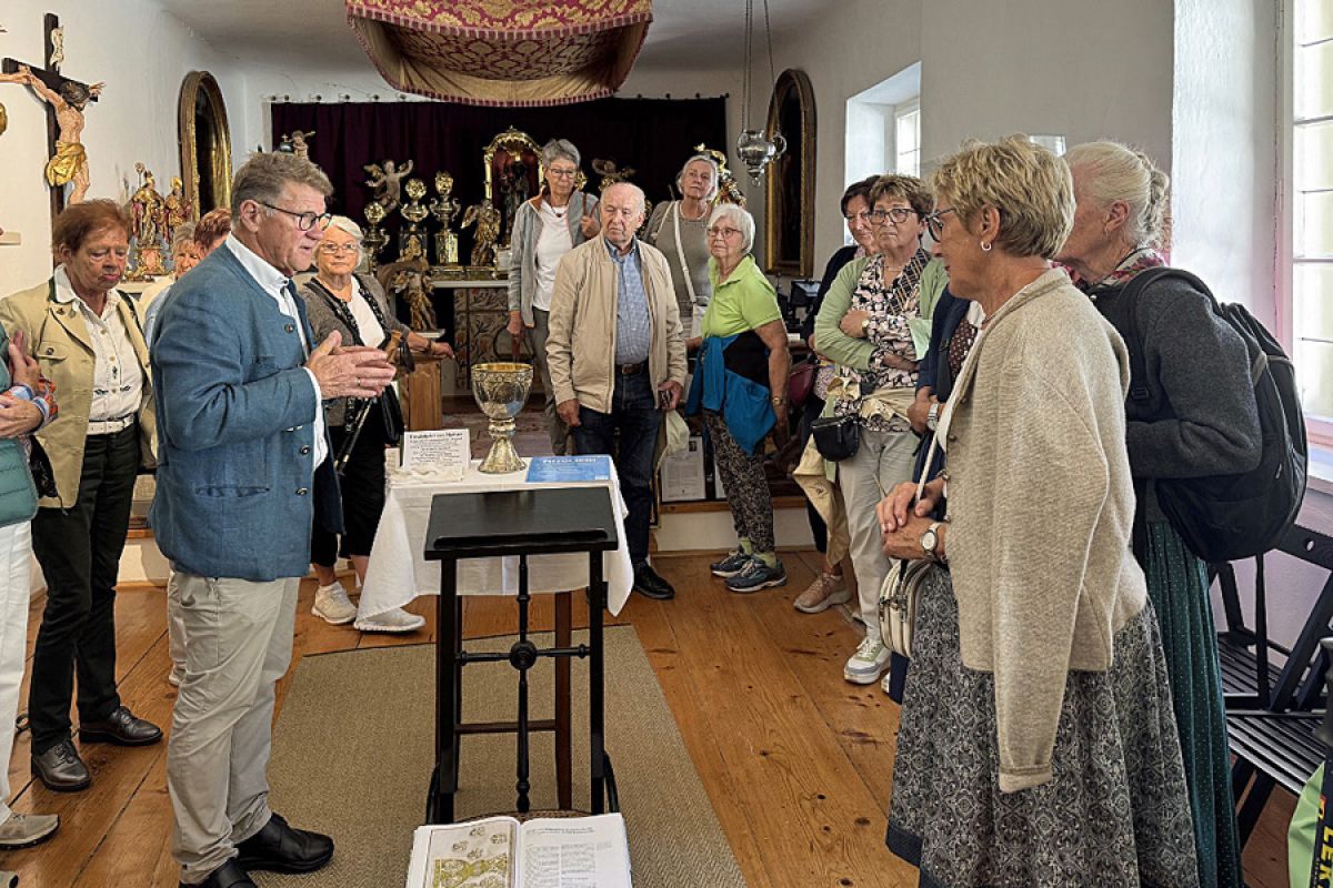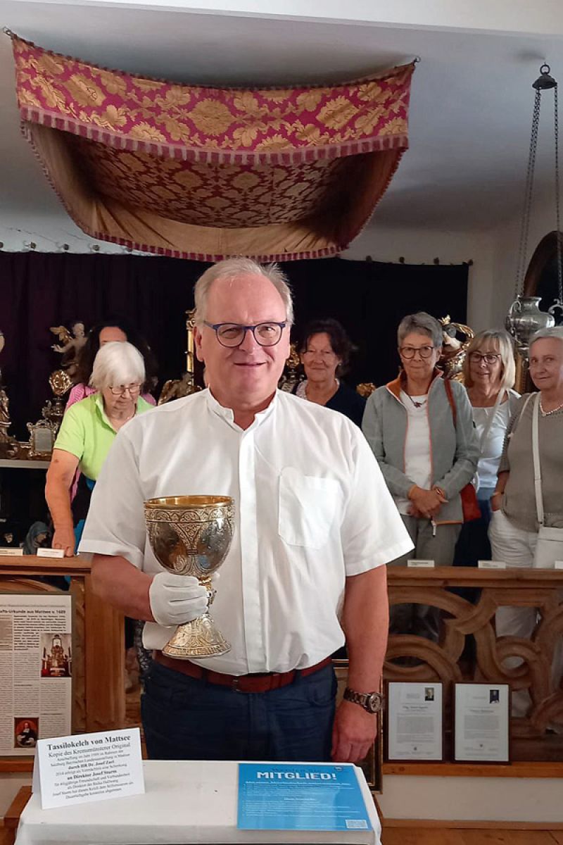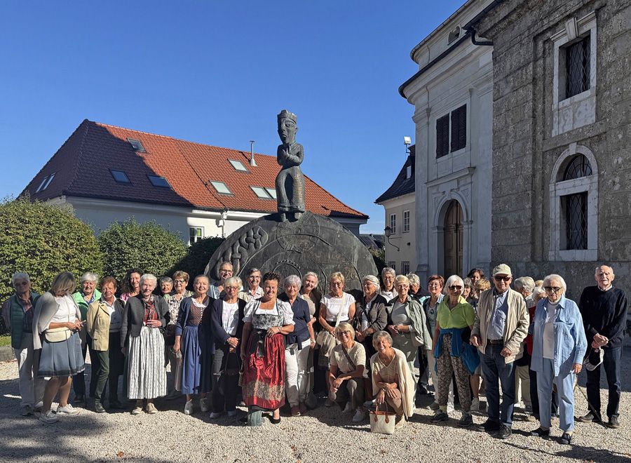 Der Seniorenstammtisch St. Andreas und der Katholische Frauenbund Berchtesgaden unternahmen einen gemeinsamen Jahresausflug zum Stift Mattsee. Bei herrlichem Spätsommerwetter erlebten wir bestens gelaunt eine schöne Fahrt mit fröhlichem Gesang entlang des Obertrumer Sees zum Mattsee. Auf dem Stiftsplatz vor der Kollegiatstiftskirche wurden wir von dem langjährigen Kustos Josef Sturm herzlich in Empfang genommen. Im Schatten der 1881 zur Hochzeitsfeier von Kronprinz Rudolf von Habsburg-Lothringen und Prinzessin Stephanie von Belgien gepflanzten Linde konnten wir viel über die Geschichte der Stiftskirche und des Stifts erfahren. Gemäß alter Überlieferung hat Bayernherzog Tassilo III. um das Jahr 760 am Mattsee eine Kirche zu Ehren des hl. Erzengels Michael errichtet und zugleich ein Kloster gegründet. Ein geschichtsträchtiges Denkmal wurde ihm zu Ehren auf dem Stiftsplatz errichtet: Auf einer drei Meter großen Bronzescheibe, gleichsam seinem Zeitrad, trohnt Tassilo hoch über den Widersprüchen seines Lebens.