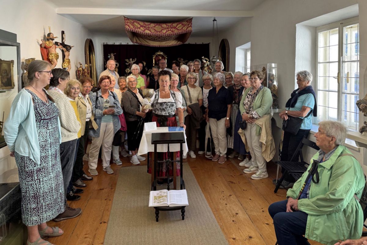 Wir bestaunten die Schatzkammer mit einer wertvollen Kopie des Tassilokelches, das Tafelzimmer mit dem gedeckten Tisch für die zwölf Kanoniker, die Gemäldegalerie mit Werken von Johann Michael Rottmayr und die Astronomische Uhr. Zum Abschluss dieses erfüllten Vormittags durften wir unter dem Thema "Begegnungen" einen schönen Gottesdienst mit unserem Pfarrer in der Stiftskirche feiern.