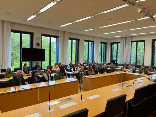 Ziel des Ausflugs ist es insbesondere im Sinne politischer Bildung die Regeln der Gesetzgebung und Volksvertretung nahe zu bringen. Nach einem informativen Film zur Einstimmung besichtigte die Gruppe die Räumlichkeiten des Maximilianeums und wohnte auf der Besuchertribüne eine Stunde der Plenarsitzung bei. Eine Möglichkeit für jeden Bürger, die durchaus nicht selbstverständlich, sondern eine Besonderheit des Bayerischen Landtags ist. Die Zuschauer staunten nicht schlecht über die Lautstärke mancher Fraktionen und auch die Tonalität der politischen Reden, die am Pult unterhalb des Sitzungspräsidenten gehalten wurden. Kann man da wirklich konzentriert dabei sein? – fragte sich so mancher.