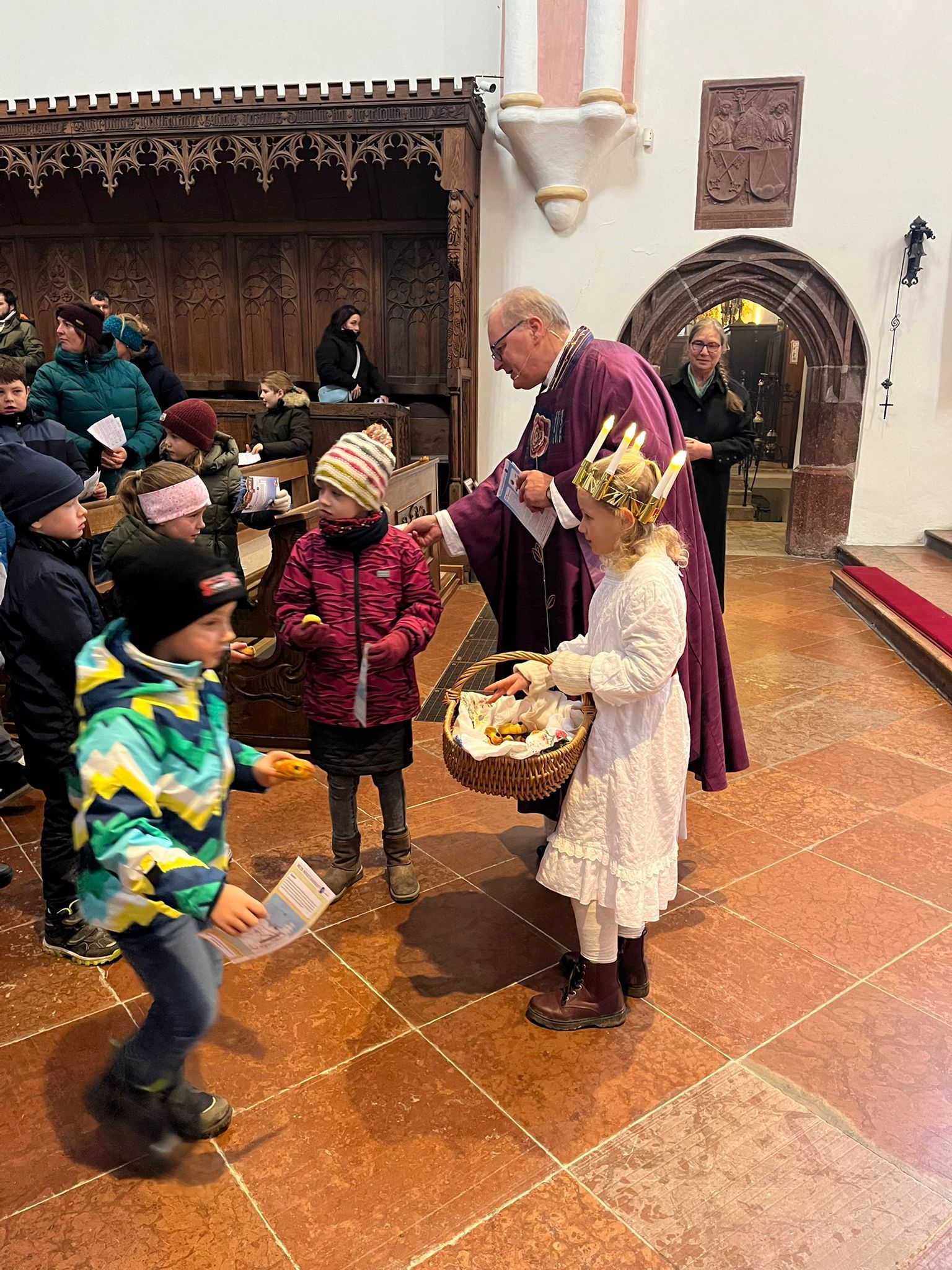 Lucia war zu ihren Lebzeiten eine sehr mutige Frau und ein Vorbild des Glaubens. Auch unsere Lucia hatte einen Korb mit frisch gebackenen Luciabroten für alle Kinder mitgebracht. Es ist in Schweden der Brauch, am Lucia-Tag frischgebackene Safranbrötchen, auf schwedisch genannt „Lysekatter“, mit der Familie zu essen und zu teilen. Die Kinder erfuhren im Gottesdienst von Frau Stangassinger auch, dass Lucia das Licht von Jesus zu allen auch heute noch bringt und die Herzen aller Menschen im Gottesdienst damit erleuchten möchte.