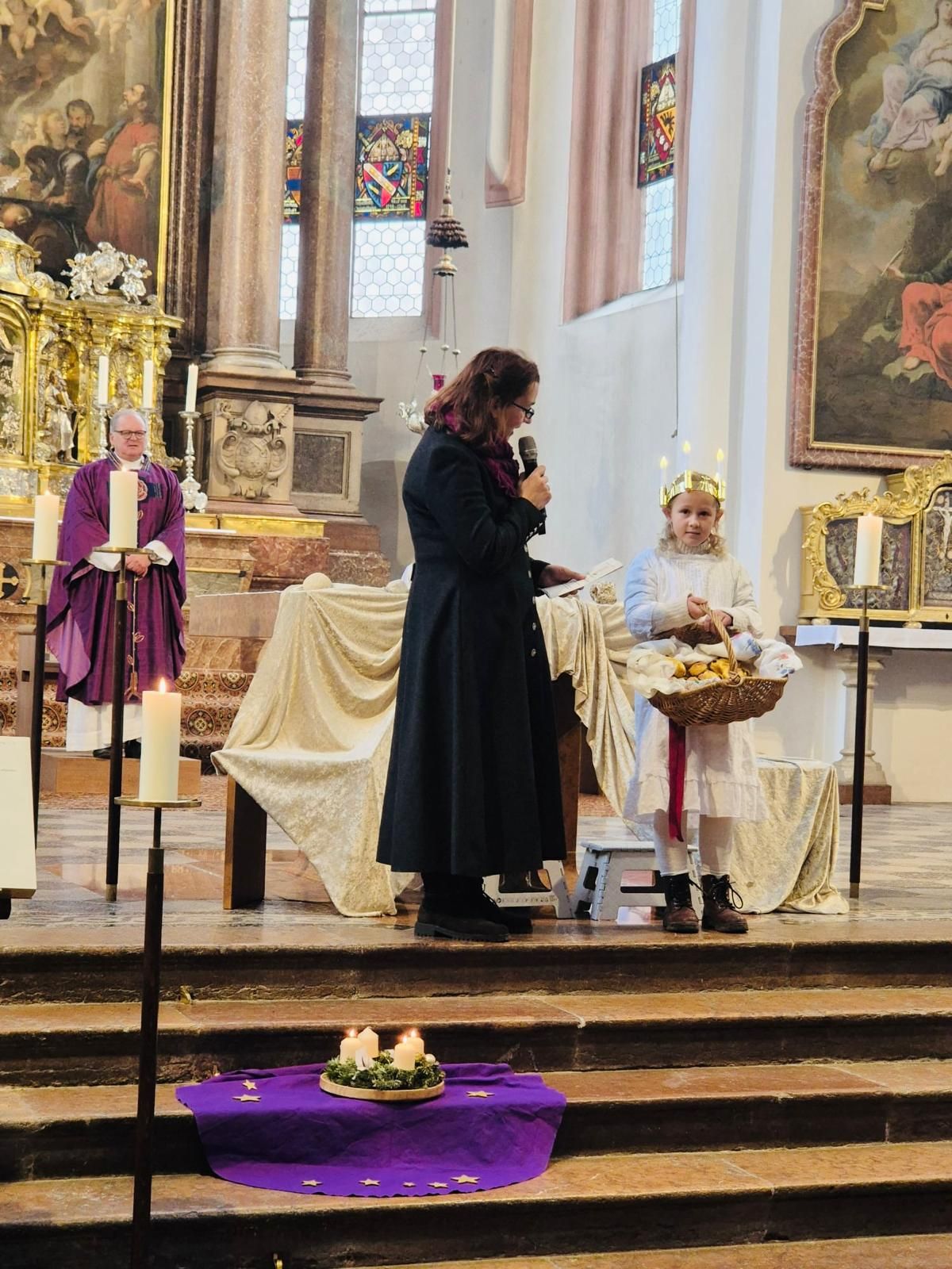 Lucia hatte ein weißes Kleid, mit einem roten Band als Gürtel an und eine Luciakrone, einen Kranz mit brennenden Kerzen, auf dem Kopf. Sie erfuhren, dass sich die ersten Christen damals verstecken mussten, weil sie wegen ihrem Glauben an Jesus Christus, verfolgt wurden. Lucia half den verfolgten Christen, die sich in den Katakomben, in Höhlen, verstecken mussten. Einen der Christen im Stück spielte Benedikt Planegger, der sich in einer vor dem Altar dargestellten Höhle, versteckte. Lucia brachte ihnen in Körben alles Wichtige, was sie zum Überleben in den dunklen, kalten Katakomben brauchten. Wasser zum Trinken, Lebensmittel zum Essen, warme Decken gegen die Kälte und Kerzen, die ihnen Licht in der Dunkelheit spenden sollten. Sie rettete ihnen dadurch das Leben.