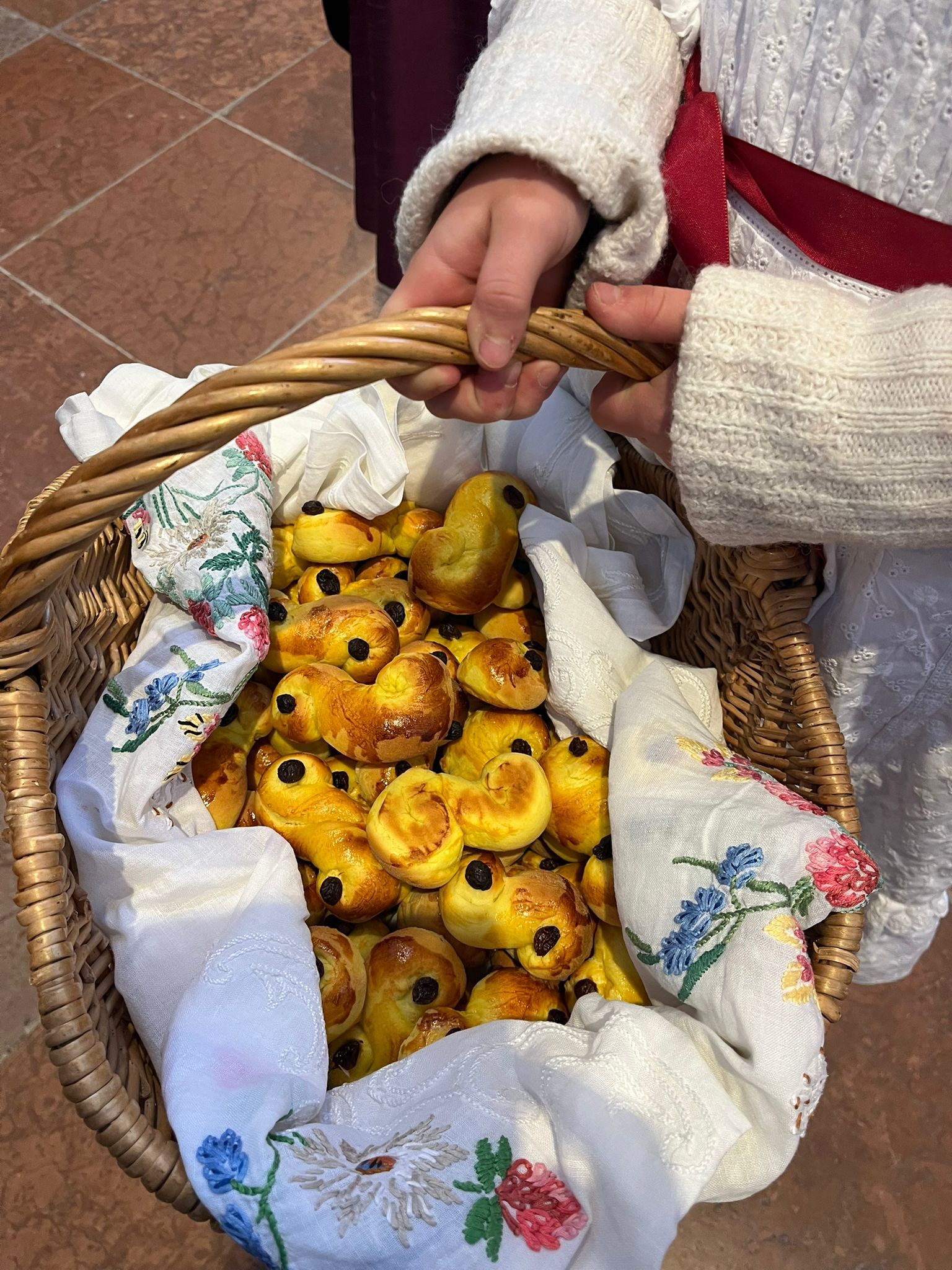 Sie erzählte auch, dass Lucia allen Freude schenken möchte, deshalb hat auch unsere Lucia einen Korb mit den Lysekatter-Lucia-Broten dabei.