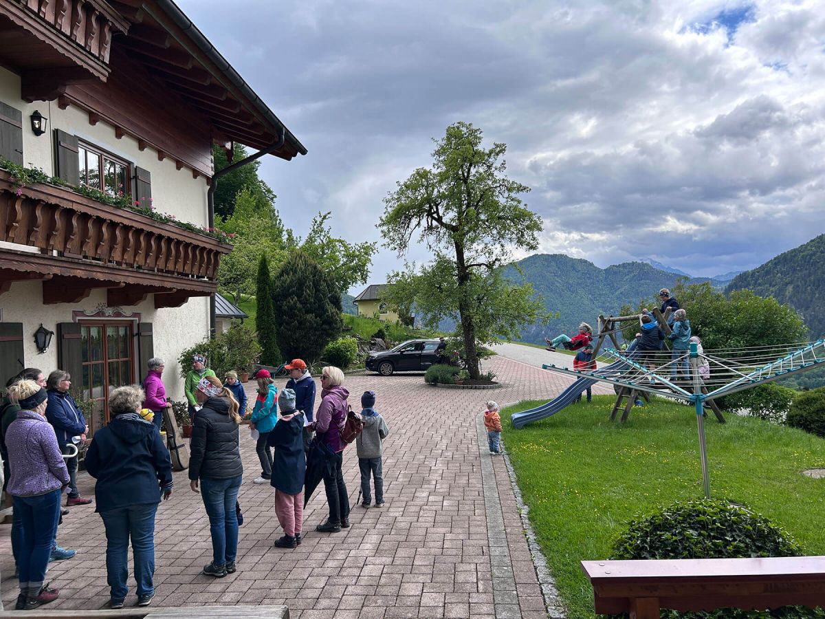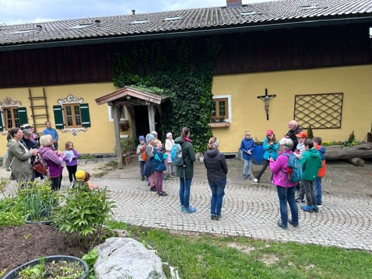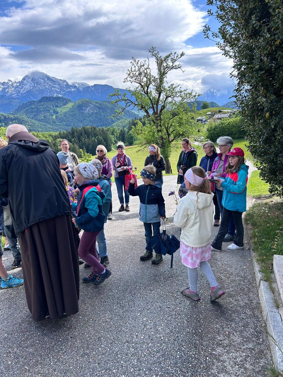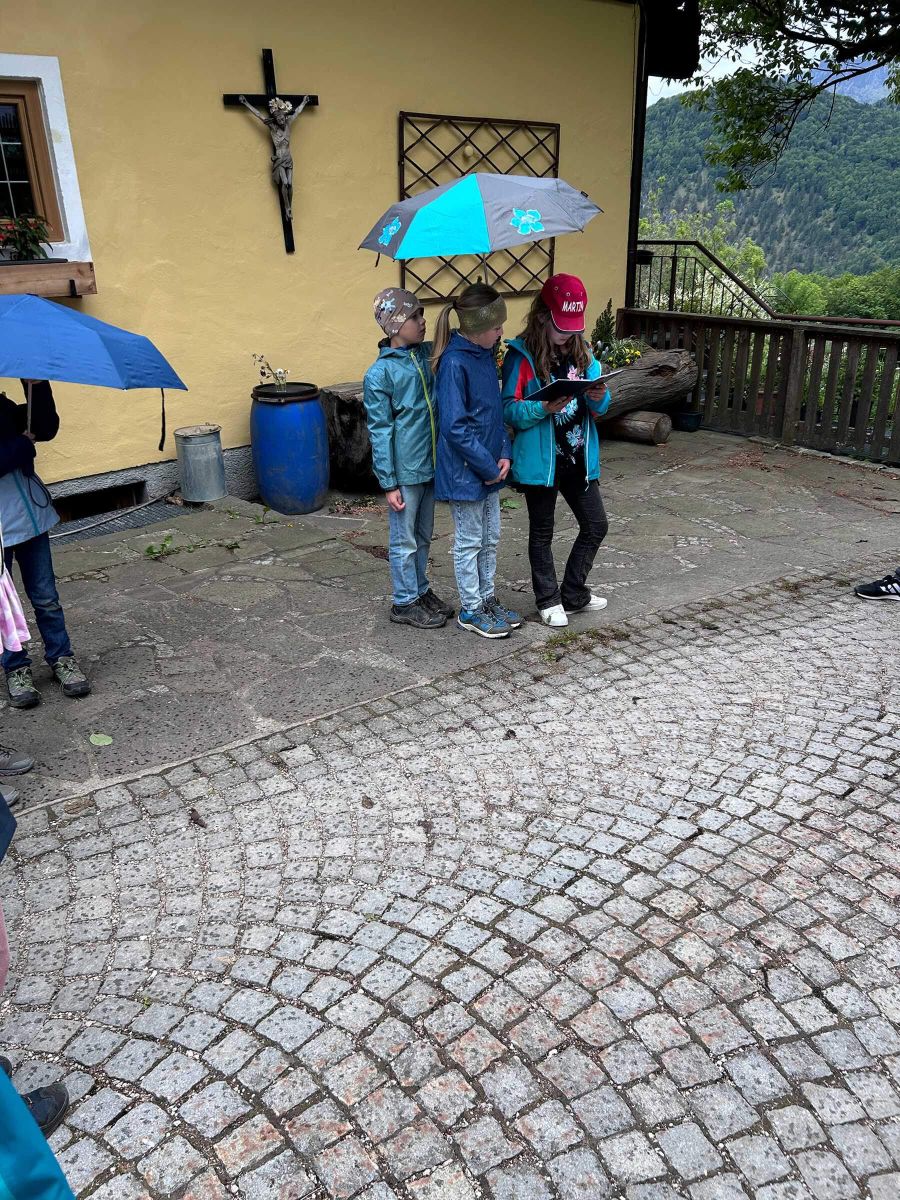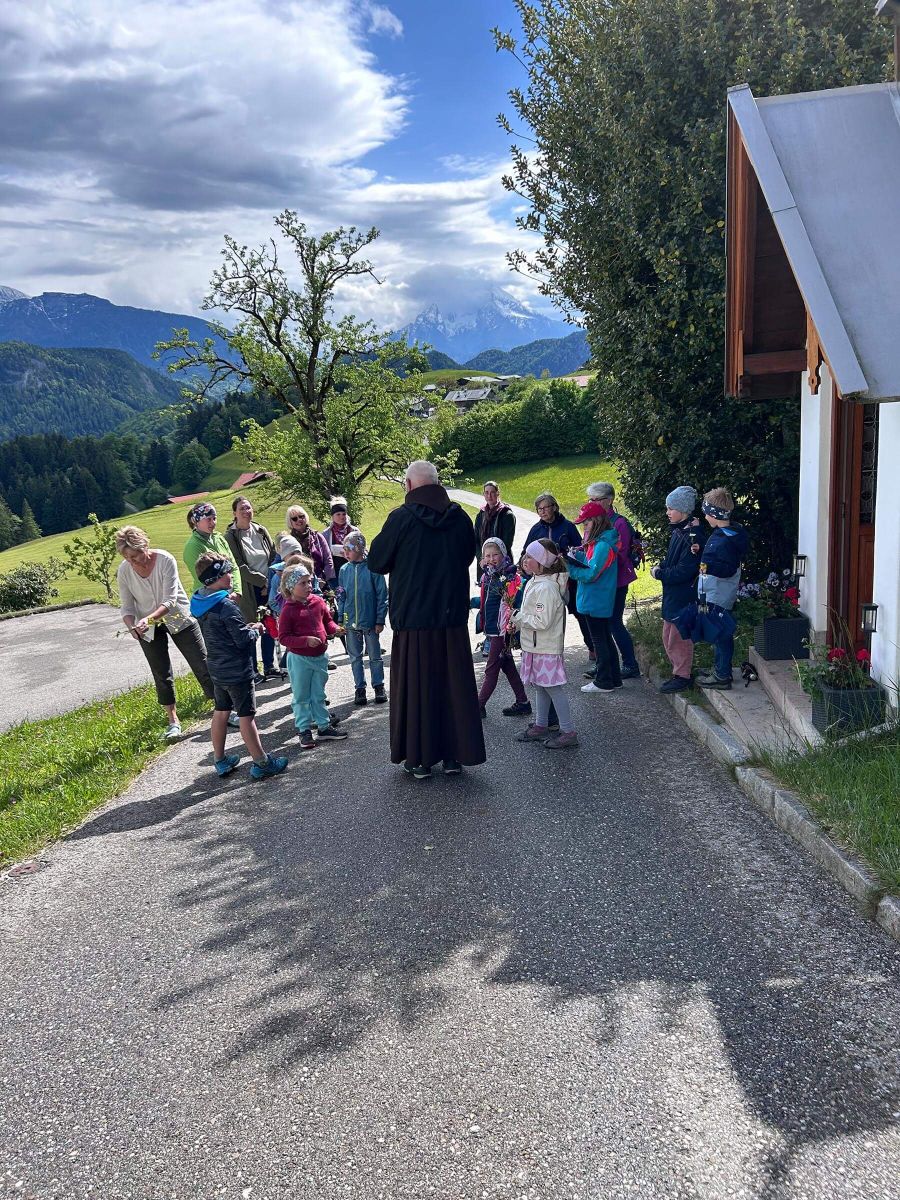 Weiter ging es zur Grasmannkapelle am Mehlweg. Auf dem Weg dorthin durften die Kinder Blumen pflücken, je eine für die Mutter Gottes und eine für ihre eigene Mutter. Die Blumen wurden dann an der Grasmannkapelle abgestellt. Mit dem Lied „Maria Dich lieben“ stellte Pater Manfred nochmals den Bezug zur Liebe einer Mutter her, ehe die Wallfahrt Richtung Bichlhof weiterging. Auch der Hl Petrus hatte ein Einsehen und so kamen wir nahezu ohne Regen dort an, wo abschließend am Hauskreuz das Evangelium und die Fürbitten vorgetragen wurden.