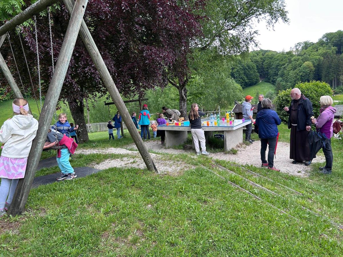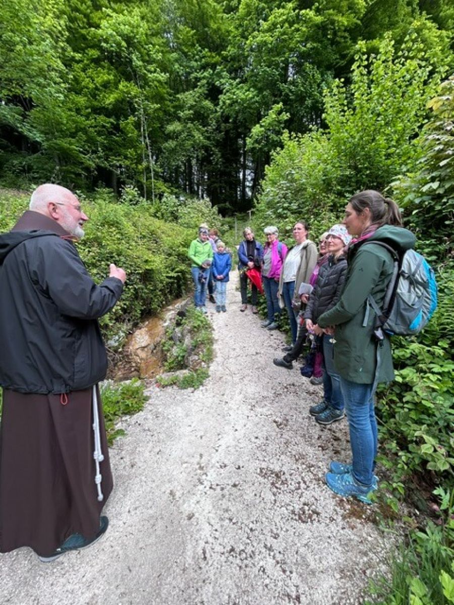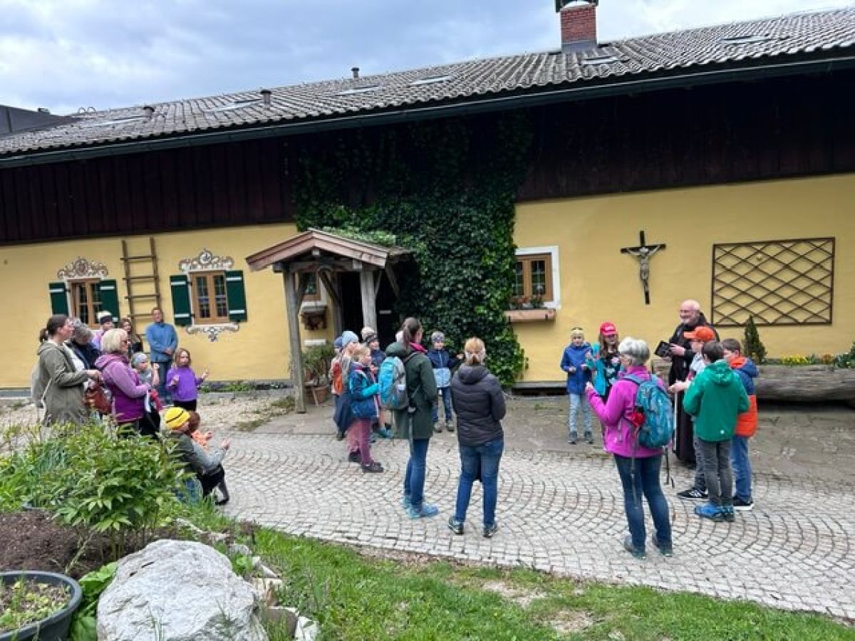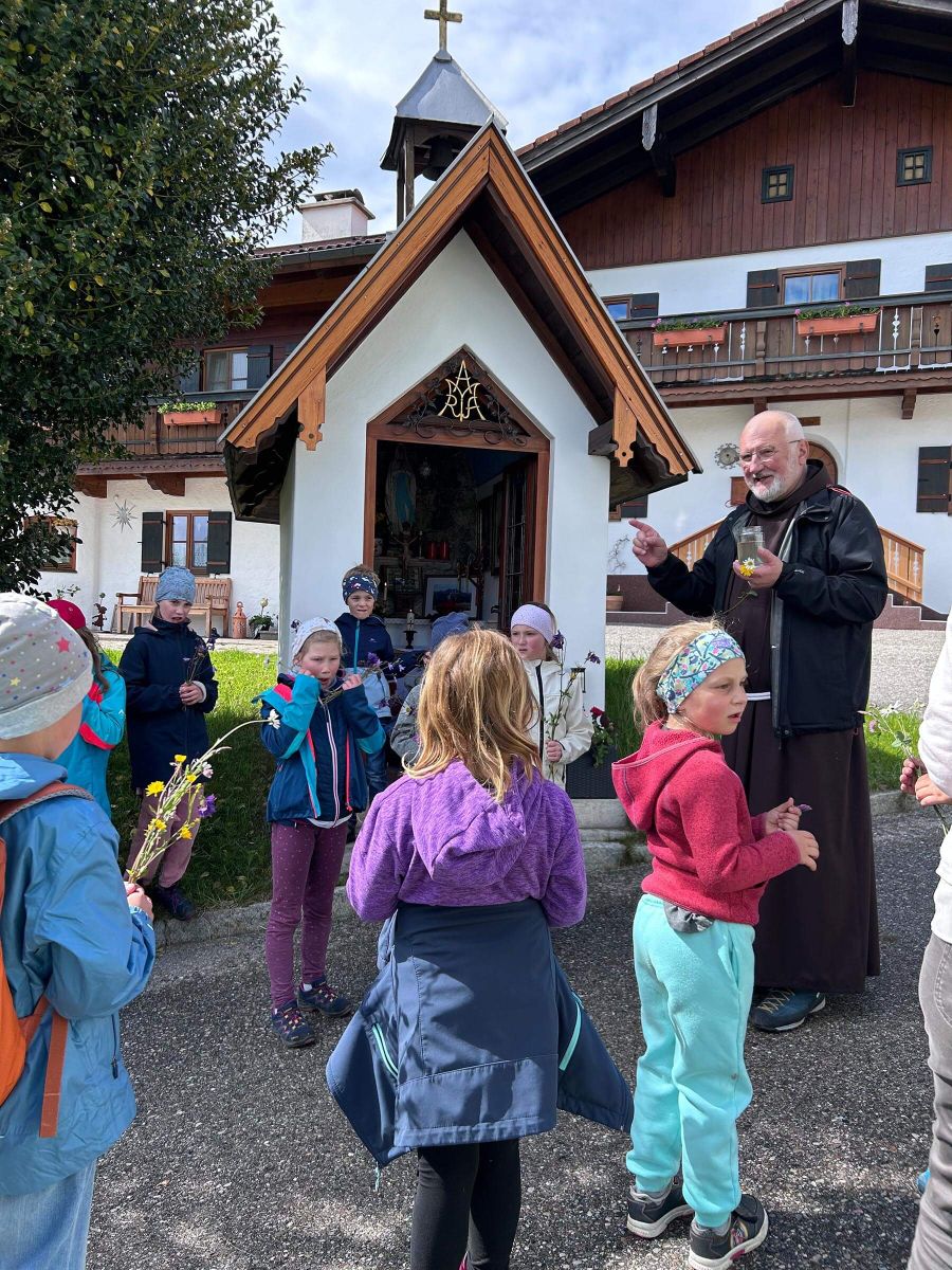 Begonnen wurde bei der Amerosenkapelle mit einer kurzen Andacht und einem schönen Lied zu Ehren der Gottesmutter, welches Michaela Hennecke anstimmte. Am Wegkreuz beim Leitenlehen war der nächste Halt und man gedachte der Verstorbenen. Pater Manfred erläuterte den Kindern das Marterl, das den Gekreuzigten mit Maria und Johannes darstellt.