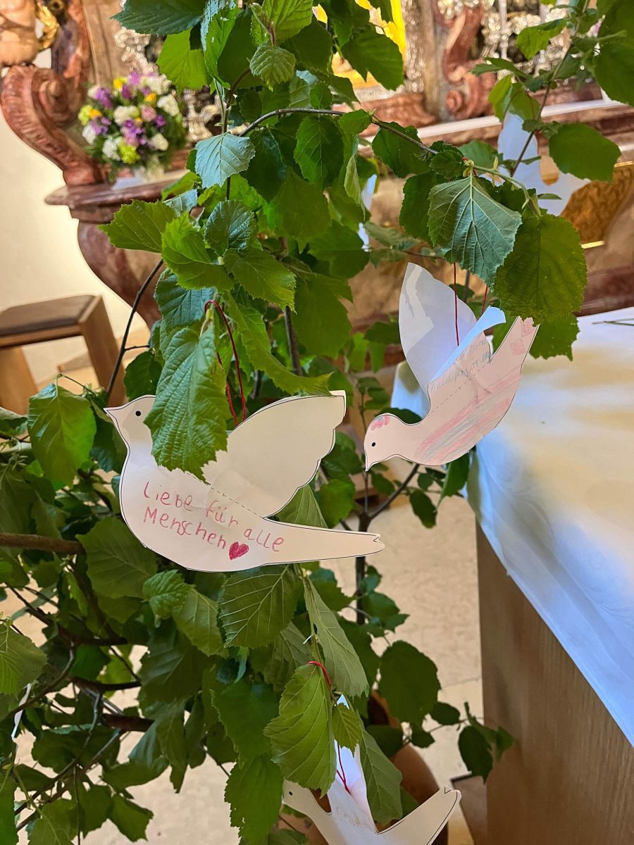 Danach durften die Kinder ihre Gegenstände dazulegen, die sie unterwegs gesammelt hatten, Herz, Krone und Blume und kurz erzählen, was sie bedeuten. Er erinnerte alle nochmal kurz daran, weshalb man sich auf den Weg zu dieser Wallfahrt gemacht habe, nämlich um Maria für den Frieden zu bitten. Anschließend beteten alle gemeinsam ein Friedensgebet zu Maria, der Königin des Friedens. Hier ein kleiner Auszug:“ Liebe Maria, Königin des Friedens, bitte hilf uns, freundlich und liebevoll zueinander zu sein. Schenke uns Frieden in unseren Herzen und in die Welt. Maria bitte bete für uns, damit wir immer friedlich miteinander leben….“. Nach einem gemeinsamen Friedenslied duften alle ihre Friedenstauben an Zweigen neben dem Altar hängen und wer mochte, durfte seinen Friedenswunsch laut vorlesen
