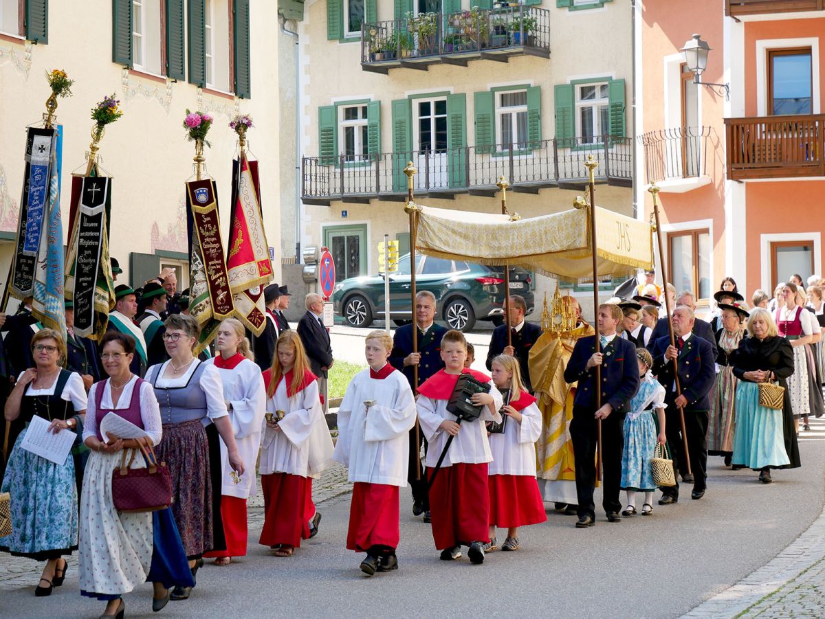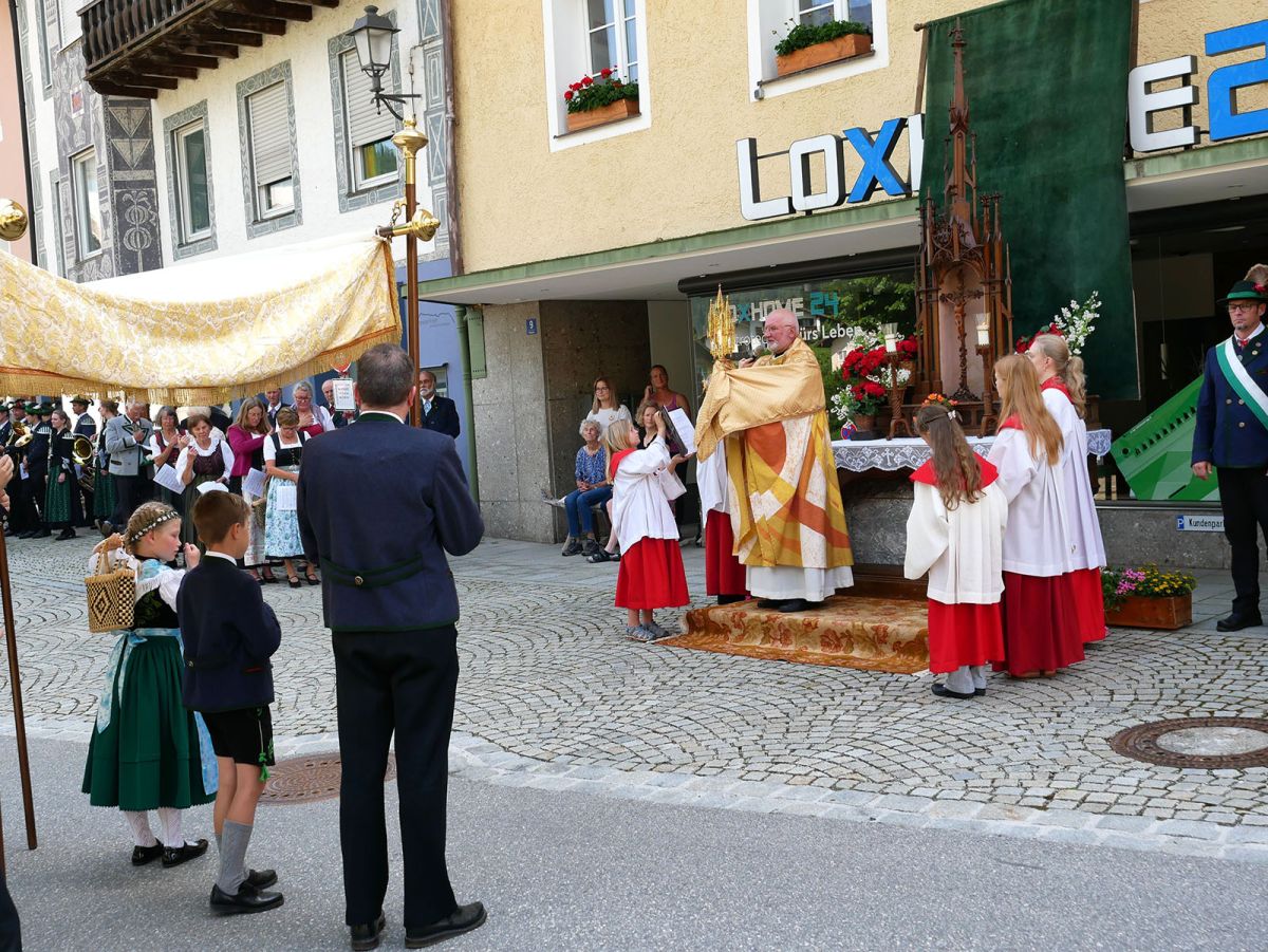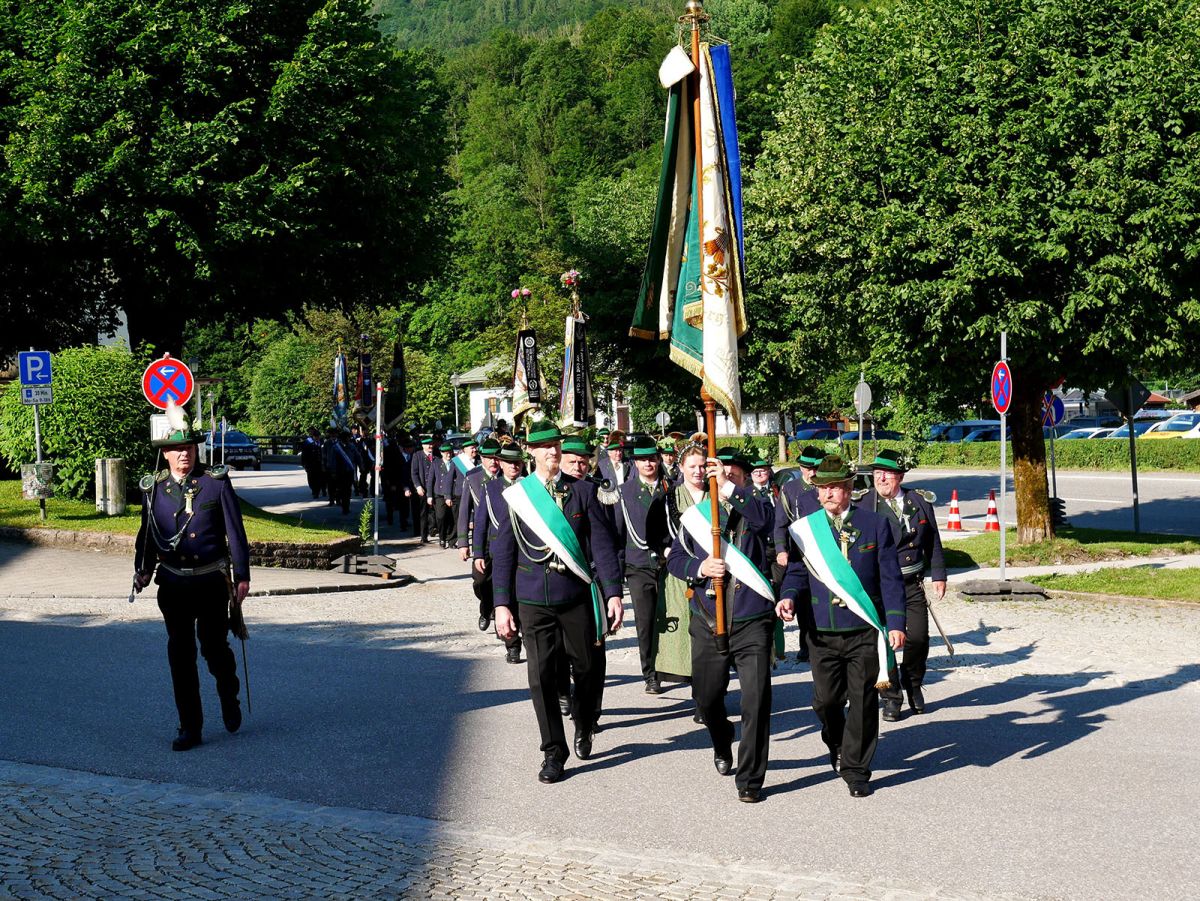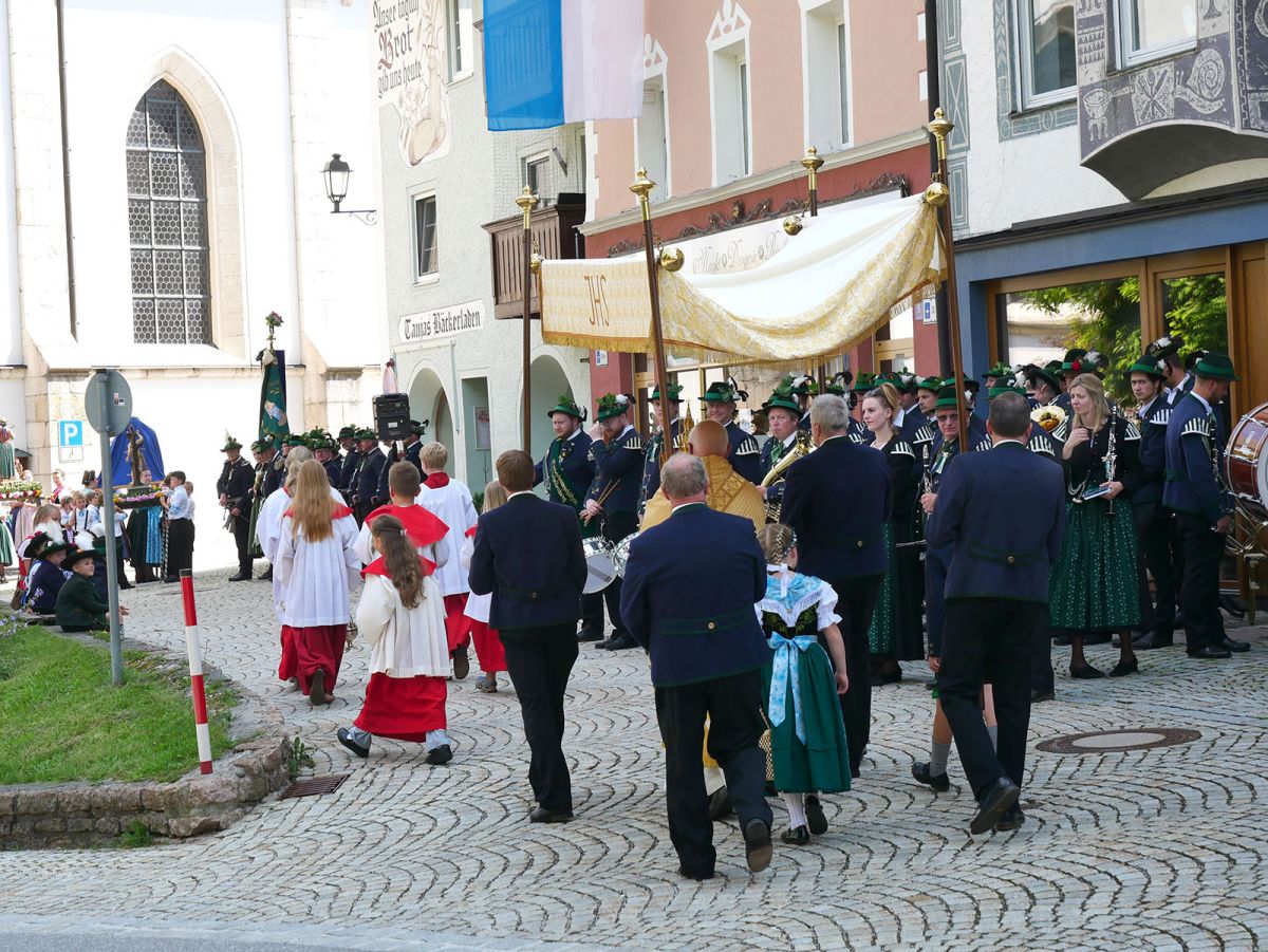 Nach Ende der Hl. Messe wurde der Kirchenzug in einer vorgegebenen Reihenfolge mit den Figurenträgern, den Vereinen und den restlichen Teilnehmern aufgestellt und es erfolgte die Prozession über die Salzburger Straße, die Alpenstraße und nach einer Umrundung des ehem. Gasthauses Forelle zurück zur Kirche. Unterwegs wurde an vier Altären der Segen erteilt und dazu schossen die Fronleichnamsschützen jeweils ihren Salut.